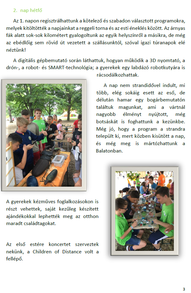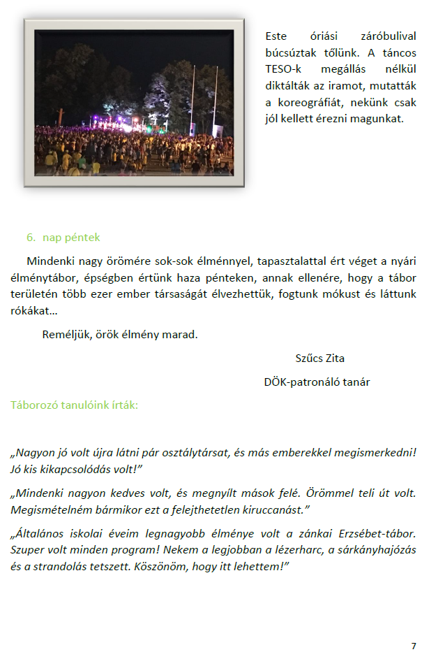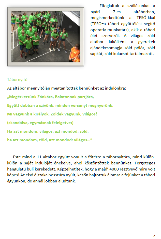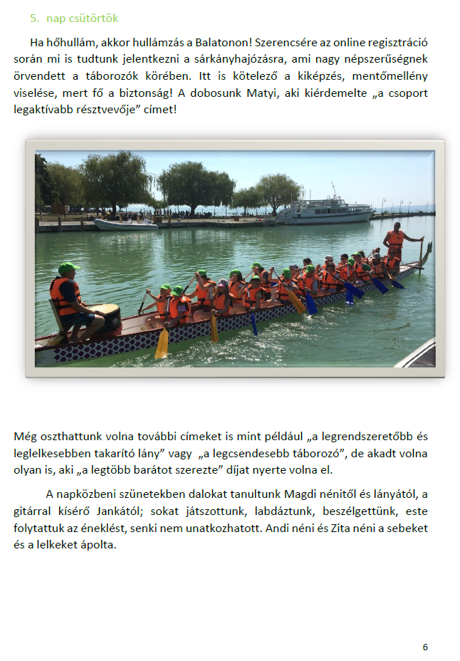 Igaz, volt sok érdekes élmény, pl. állatkert, sportszeletkészítés, mozizás, de a közös éneklések tetszettek a legjobban.