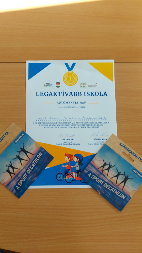 Szeretném az iskola vezetősége és tantestülete nevében köszönetemet kifejezni az autómentes napon nyújtott önzetlen aktivitásukért, valamint ezúton tudatni Önökkel, hogy iskolánk nyerte el a LEGAKTÍVABB ISKOLA címet és a vele járó 100.000 Ft. Decathlon vásárlási utalványt!
